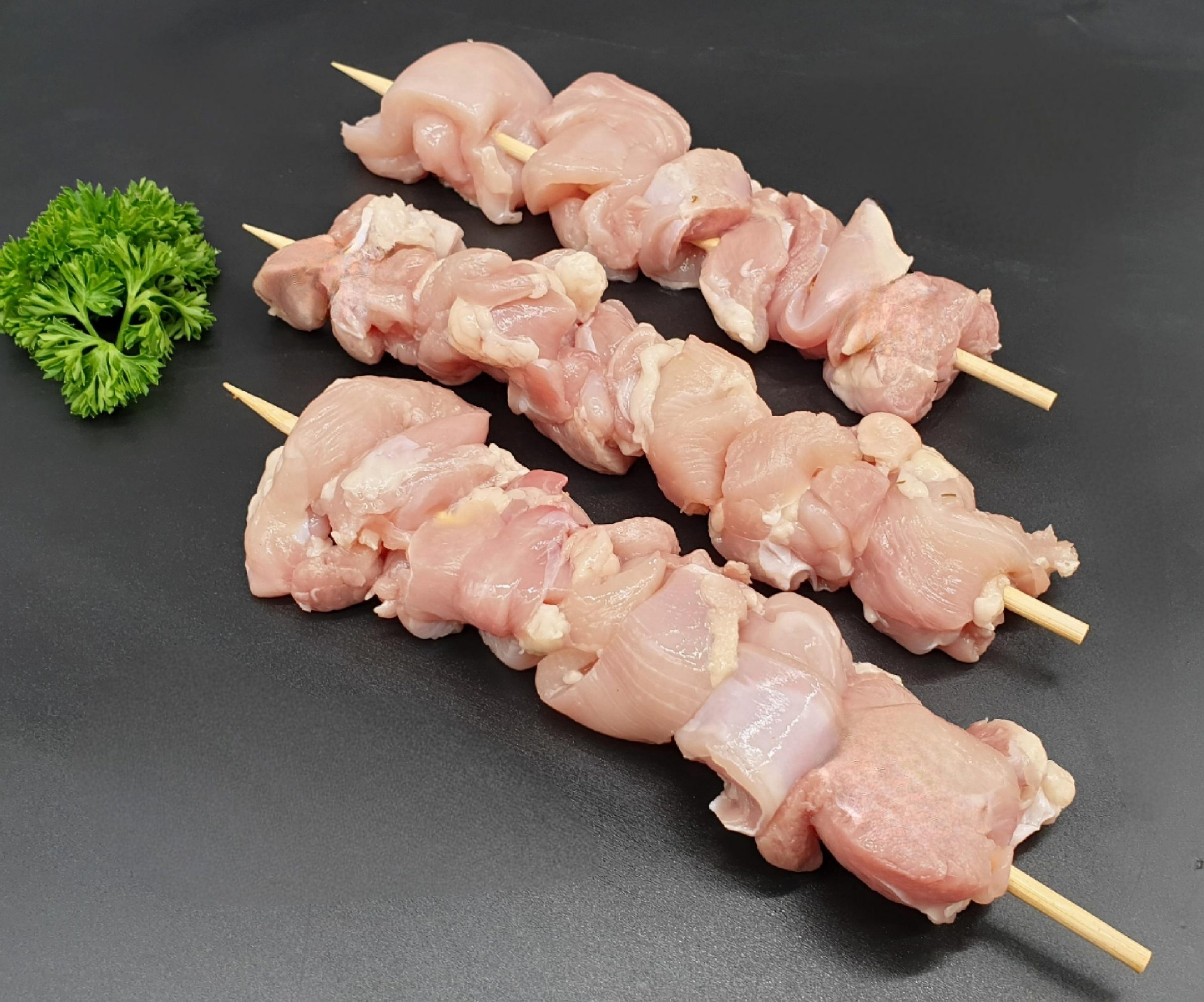 Succulent chunks of chicken on bamboo skewers – available with or without marinade
