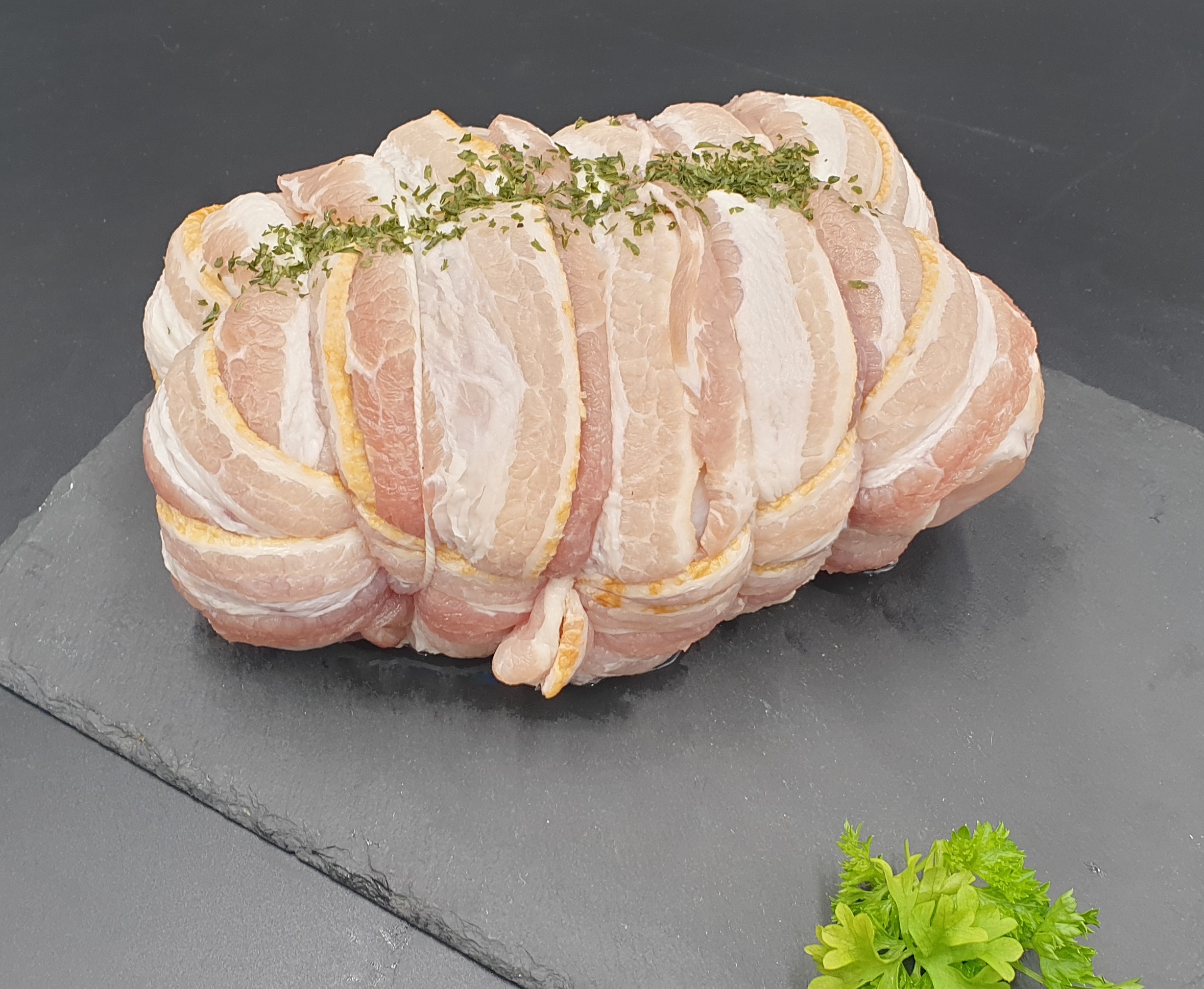 A whole, deboned chicken, stuffed with sausage meat & sage and onion stuffing, wrapped in streaky bacon and seasoned with parsley. Absolutely delicious hot or cold.