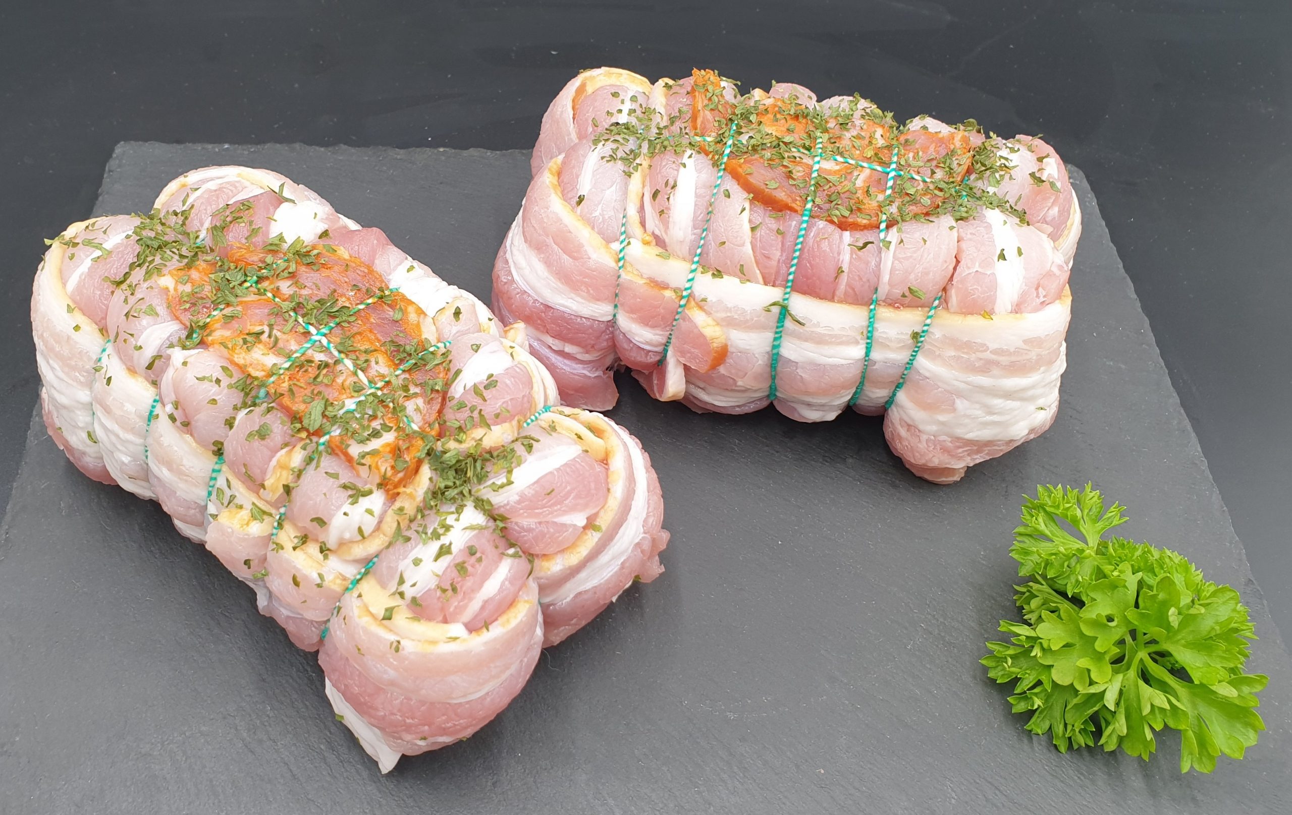 Boneless chicken thigh meat, stuffed with mozzarella and chorizo, wrapped in streaky bacon and seasoned with parsley.